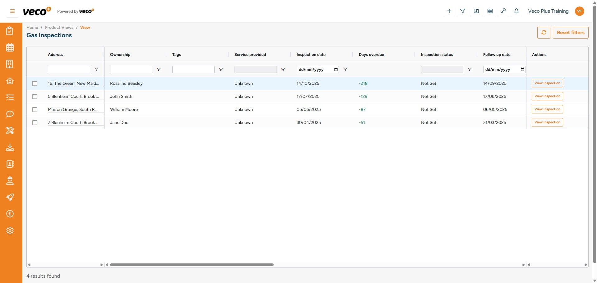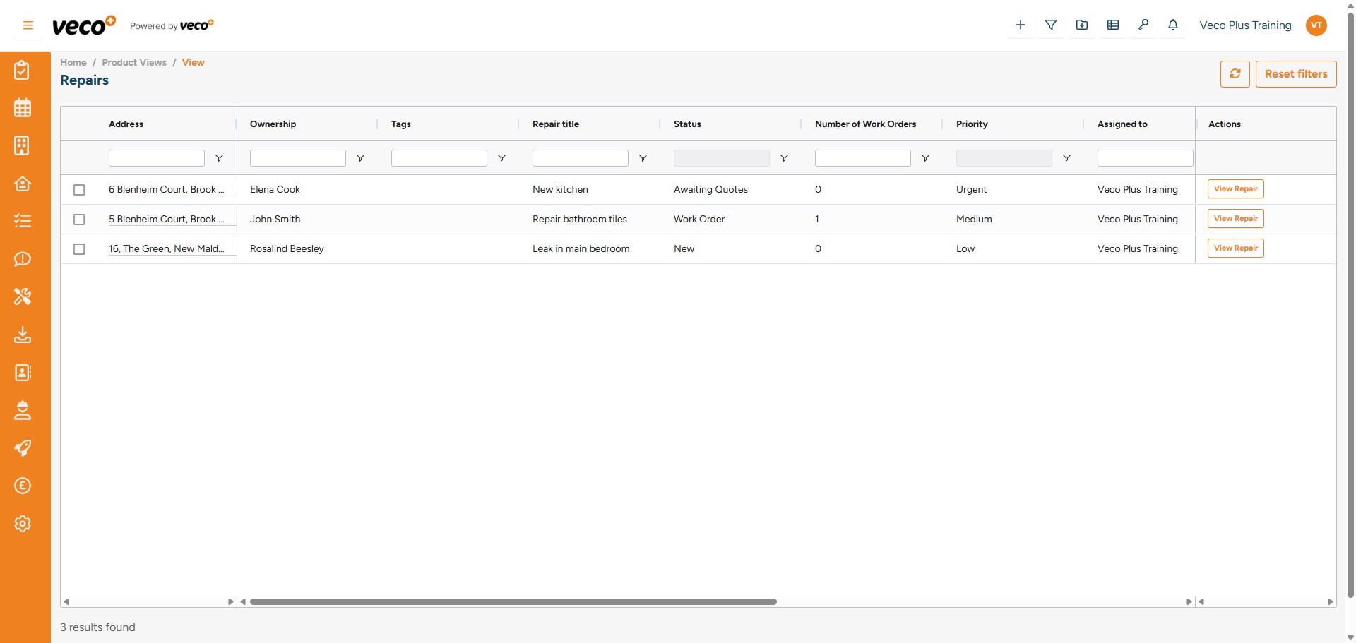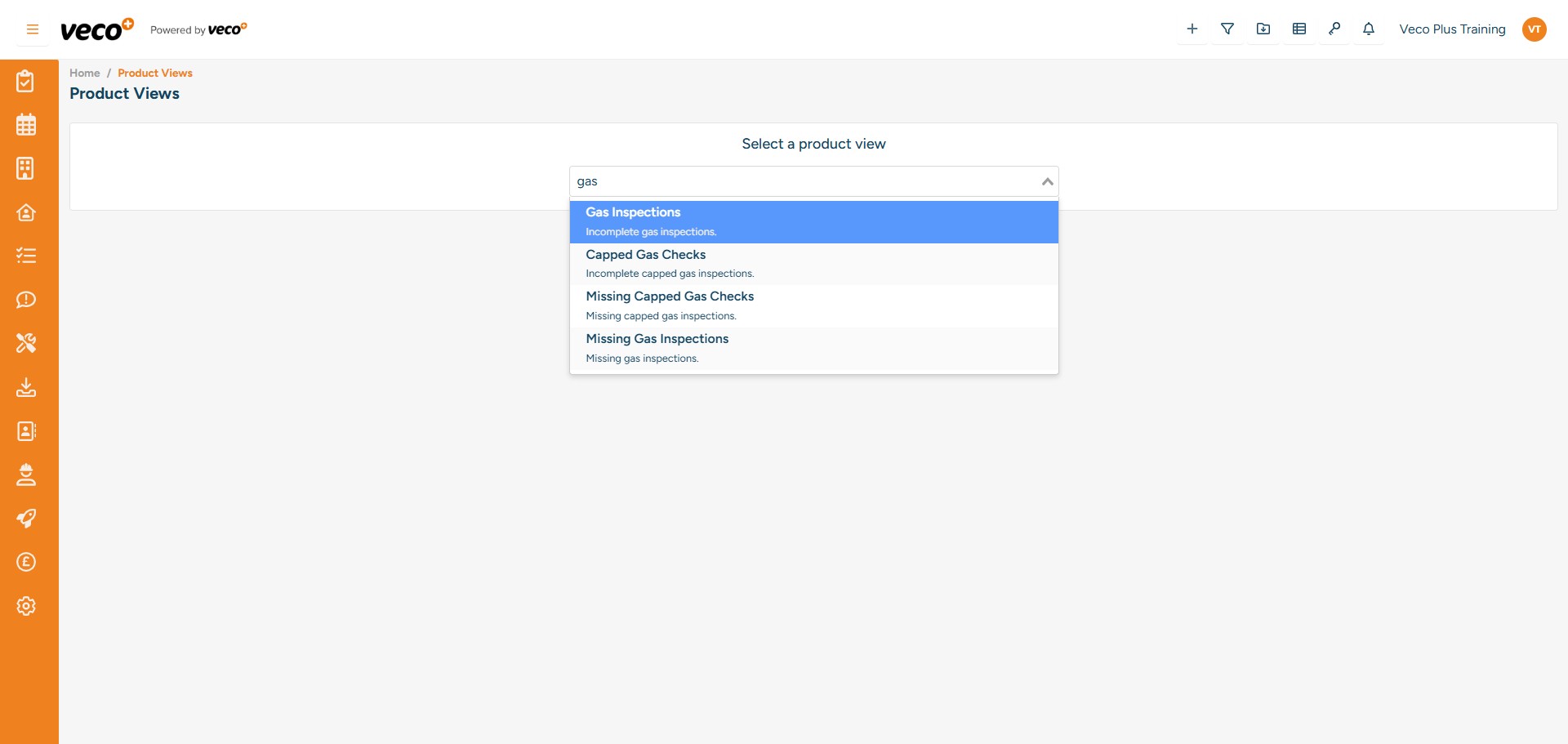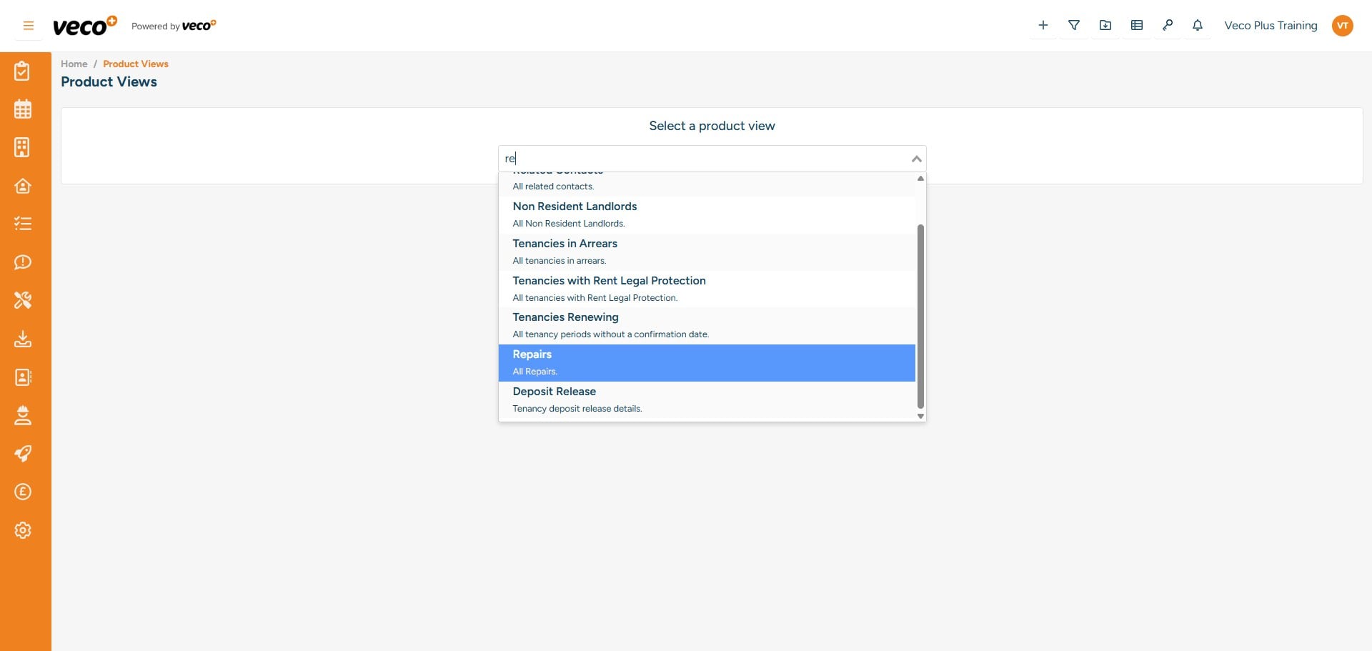 Please select the ‘View’ you would like to open. Views are grids of data that you can filter, sort and export from Veco Plus. You can type a keyword in the search box, such as ‘Repairs’, and the list will filter to ‘Repairs’