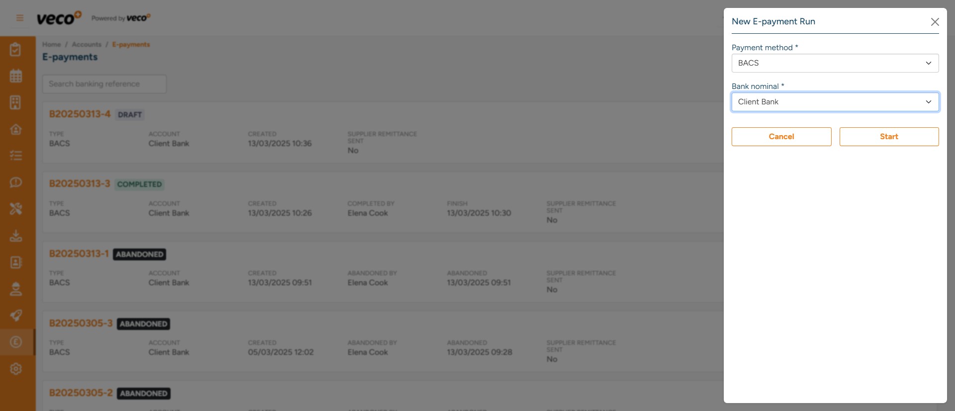 Select the 'Payment method' and the 'Bank nominal' that you would like to process the E-payments run for, then select 'Start'