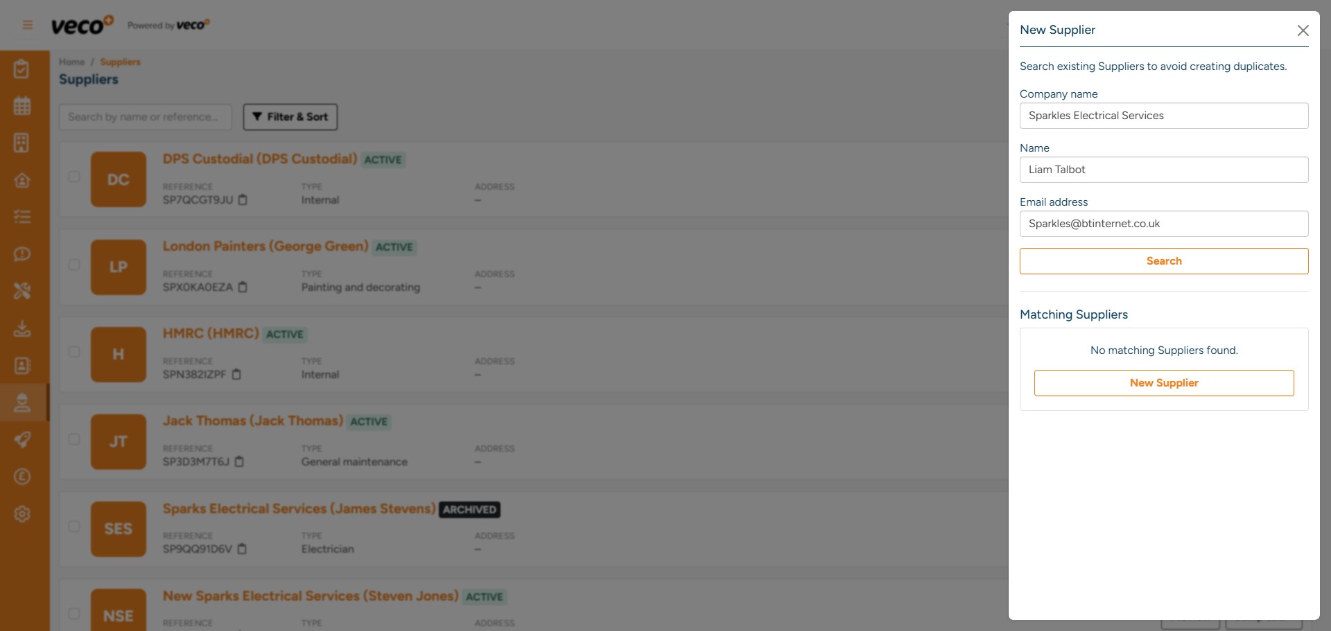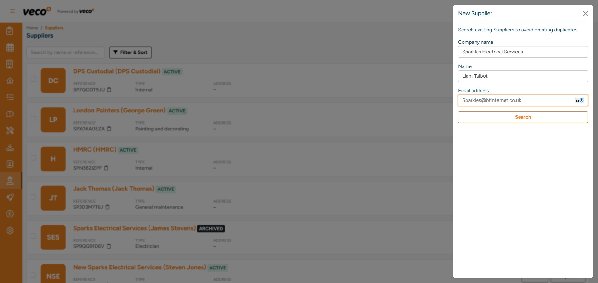 Enter the required information for the supplier. Select ‘Search’ – this will check if the supplier already exists. If the supplier already exists, Veco Plus will give you the option to ‘View’ the existing supplier