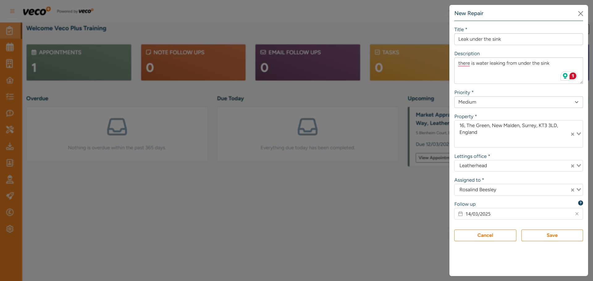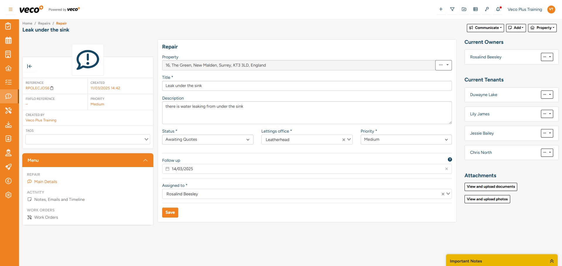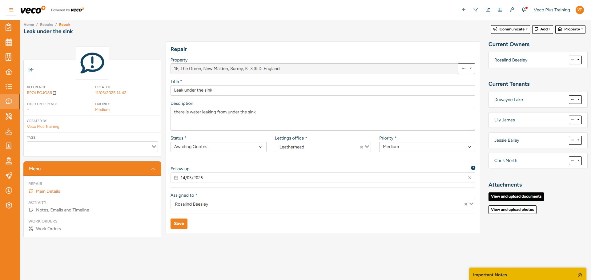 Add a title for the Repair and complete the relevant information – this will include a description of the Repair, the priority, the property address the Repair relates to and who the assigned staff user dealing with the Repair is. A ‘Follow up’ can also be added – this follow up date will appear in the repairs ‘View’ shown later in this manual. Select ‘Save’