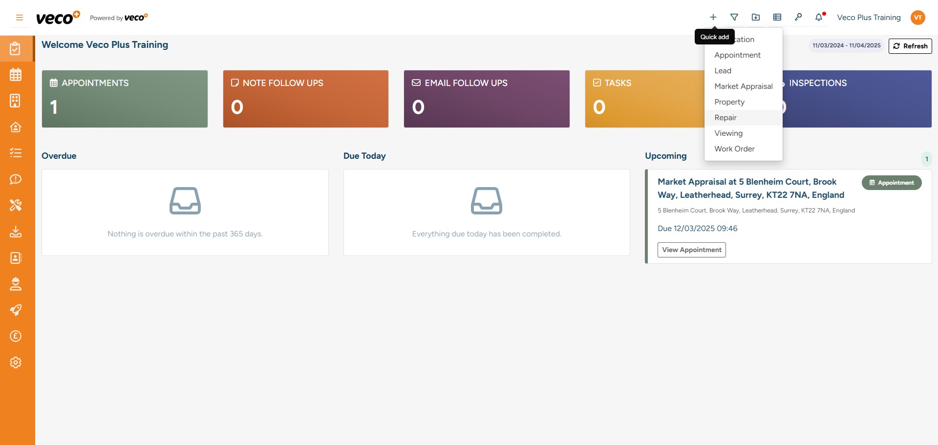 You can view and monitor all repairs from the ‘Repairs’ view. The view will also display the follow up date added to the Repair, and this column can be filtered by date. You can also open any Repair from this View from the 'Actions' column
