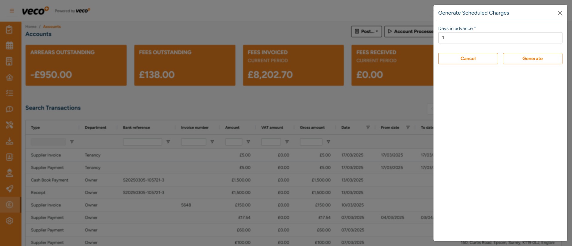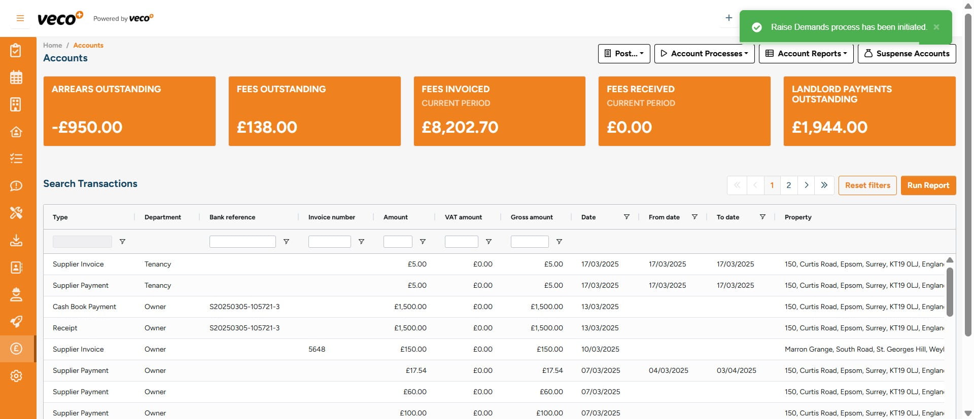 Please note that Demands in Veco Plus are raised automatically overnight, and pulled through from the scheduled charges. However, should you wish to raise the demands manually, the process is as follows